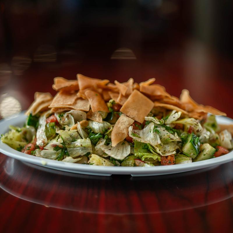 Lettuce, tomatoes, cucumbers, onions, radish, mint, parsley & toasted pita chips. Dressed with extra virgin olive oil.