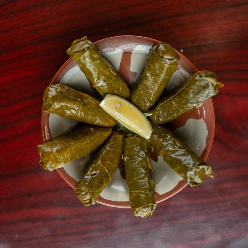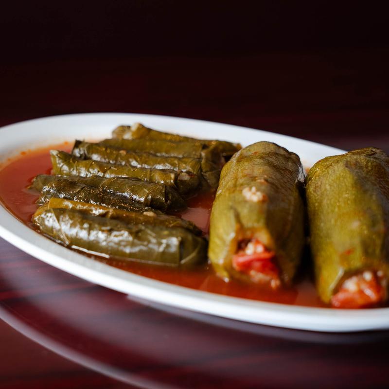 Rolled vine leaves stuffed with rice, tomatoes, mint, parsley, onions, and lemon juice. Dressed with extra virgin olive oil.