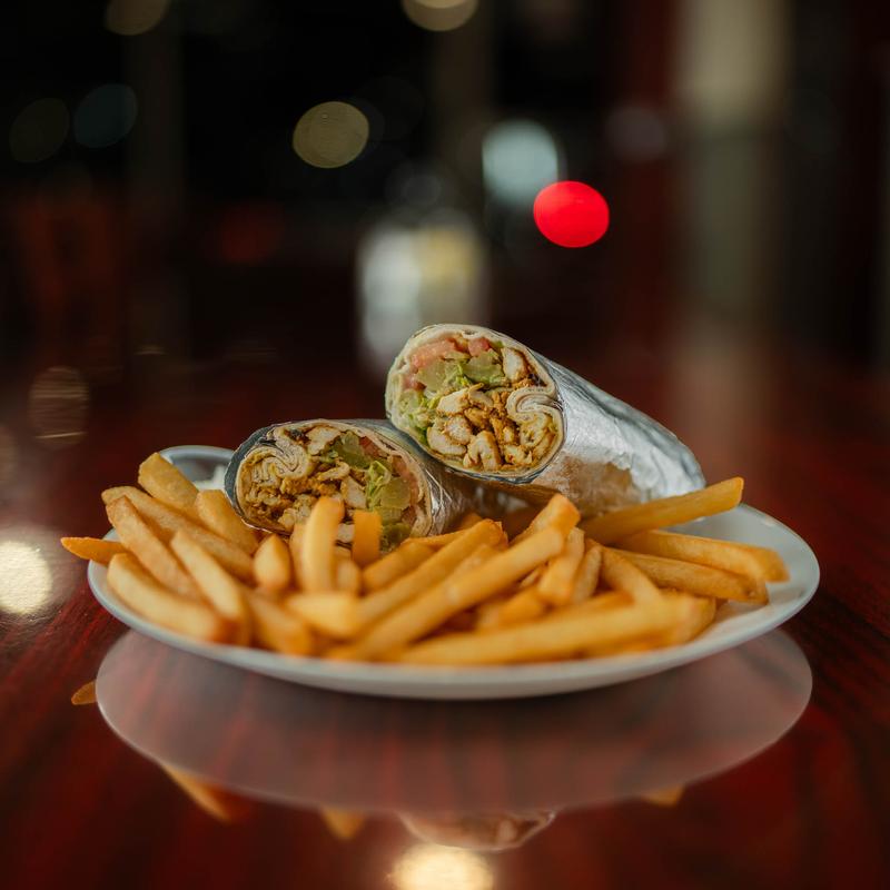 Tender cubes of marinated, grilled boneless chicken breast, wrapped in pita bread with tomatoes, fries, lettuce garlic sauce.