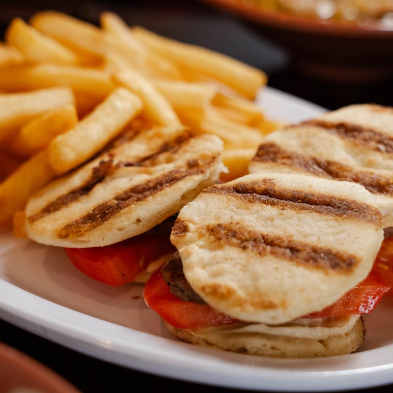 3 Mini grilled Kufta burgers, served with hummus and French fries.