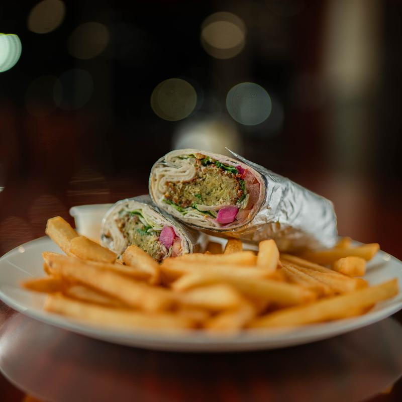 Chickpea patties seasoned with onions, garlic, parsley, and spices. Lightly fried, wrapped in pita bread with lettuce, tomatoes, pickles & tahini sauce.
