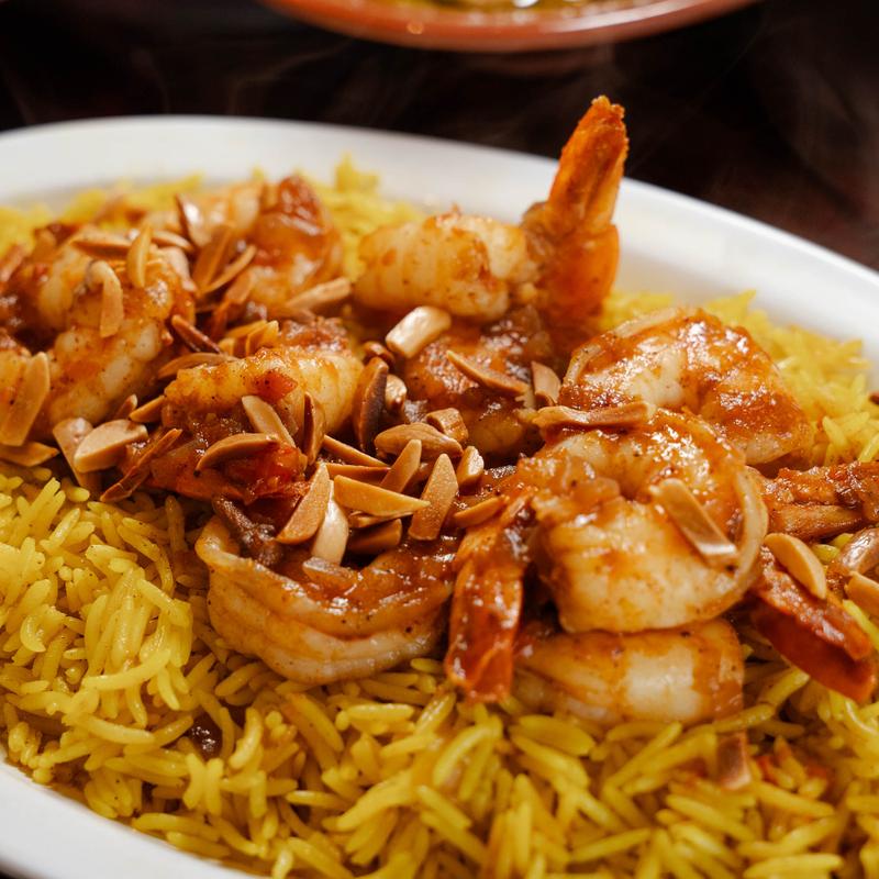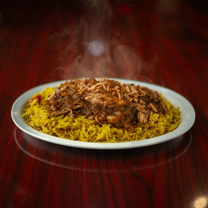 Juicy Lamb Shank over a mixture of basmati rice and spices, topped with nuts.