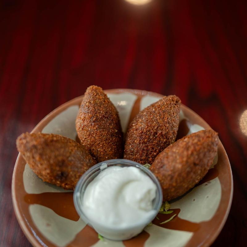 Ground beef and crushed wheat shells stuffed with ground beef, diced onions, and pine nuts. Served with yogurt sauce.